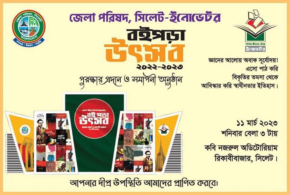 জেলা পরিষদ, সিলেট-ইনোভেটর বইপড়া উৎসব ২০২২-২৩’ আসরের পুরস্কার প্রদান এবং সমাপনী অনুষ্ঠান আগামী শনিবার (১১ মার্চ) বিকেল ৩টায় নগরীর রিকাবীবাজারস্থ কবি নজরুল অডিটোরিয়ামে অনুষ্ঠিত হবে।