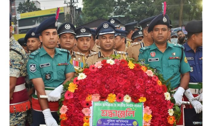 এর অংশ হিসেবে ভোরে সিলেট কেন্দ্রীয় শহিদমিনার ও বঙ্গবন্ধু ম্যুরালে শ্রদ্ধা নিবেদন করেন সিলেট মেট্রোপলিটন পুলিশ কমিশনার মো. ইলিয়াছ শরীফ, বিপিএম (বার) পিপিএম।