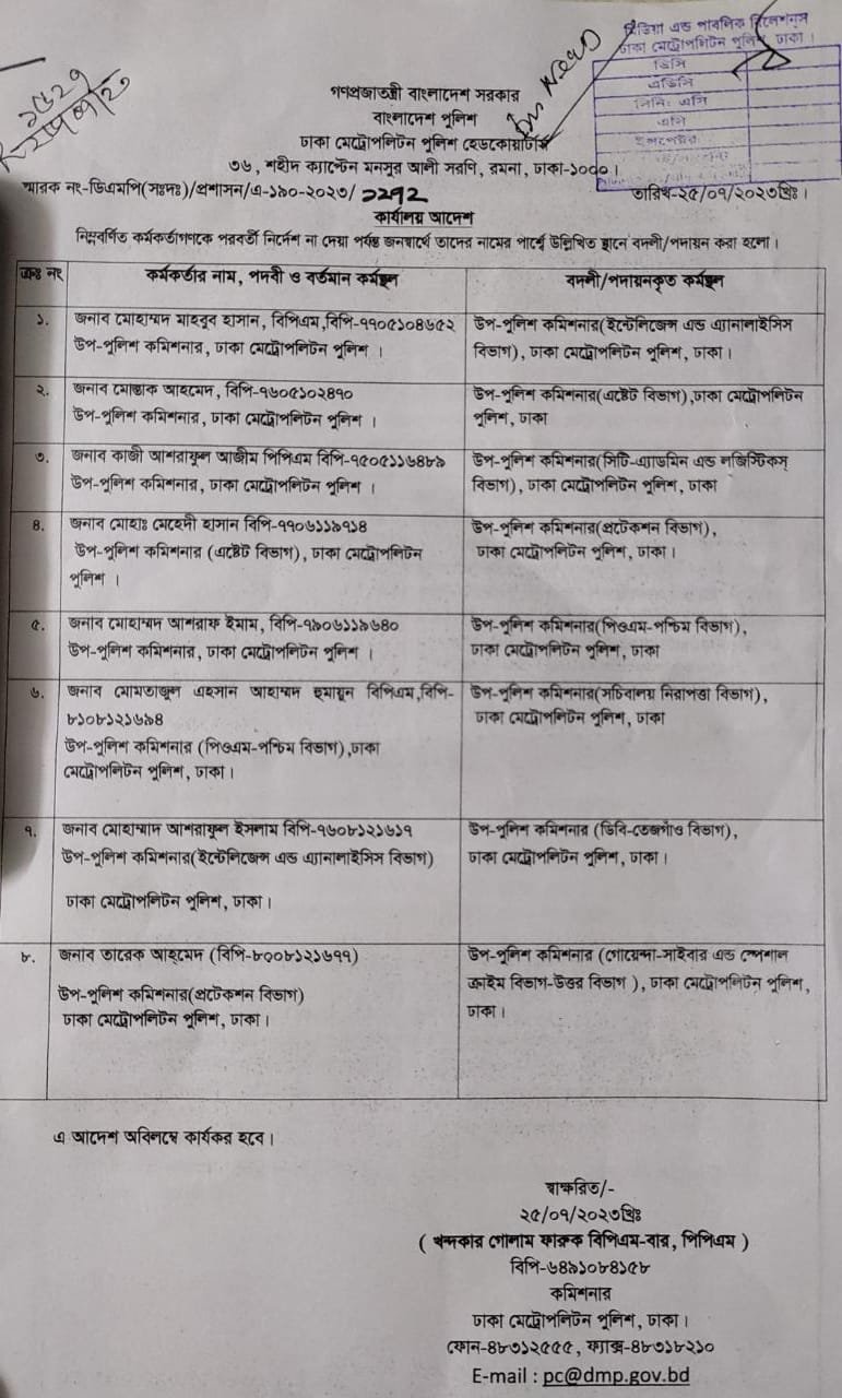 পদায়নকৃত কর্মকর্তাদের মধ্যে মোহাম্মদ মাহবুব হাসানকে ইন্টেলিজেন্স অ্যান্ড অ্যানালাইসিস বিভাগে, মোস্তাক আহমেদকে এস্টেট বিভাগে, কাজী আশরাফুল আজীমকে সিটি অ্যাডমিন অ্যান্ড লজিস্টিকস বিভাগে, মোহাম্মদ মেহেদী হাসানকে প্রটেকশন বিভাগে, মোহাম্মদ আশরাফ ইমামকে পিওএম পশ্চিম বিভাগে, মোমতাজুল এহাসন আহাম্মদ হুমায়ুনকে সচিবালয় নিরাপত্তা বিভাগে, মোহাম্মদ আশরাফুল ইসলামকে ডিবি তেজগাঁও বিভাগে এবং তারেক আহমেদকে গোয়েন্দা-সাইবার অ্যান্ড স্পেশাল ক্রাইম উত্তর বিভাগে বদলি করা হয়।