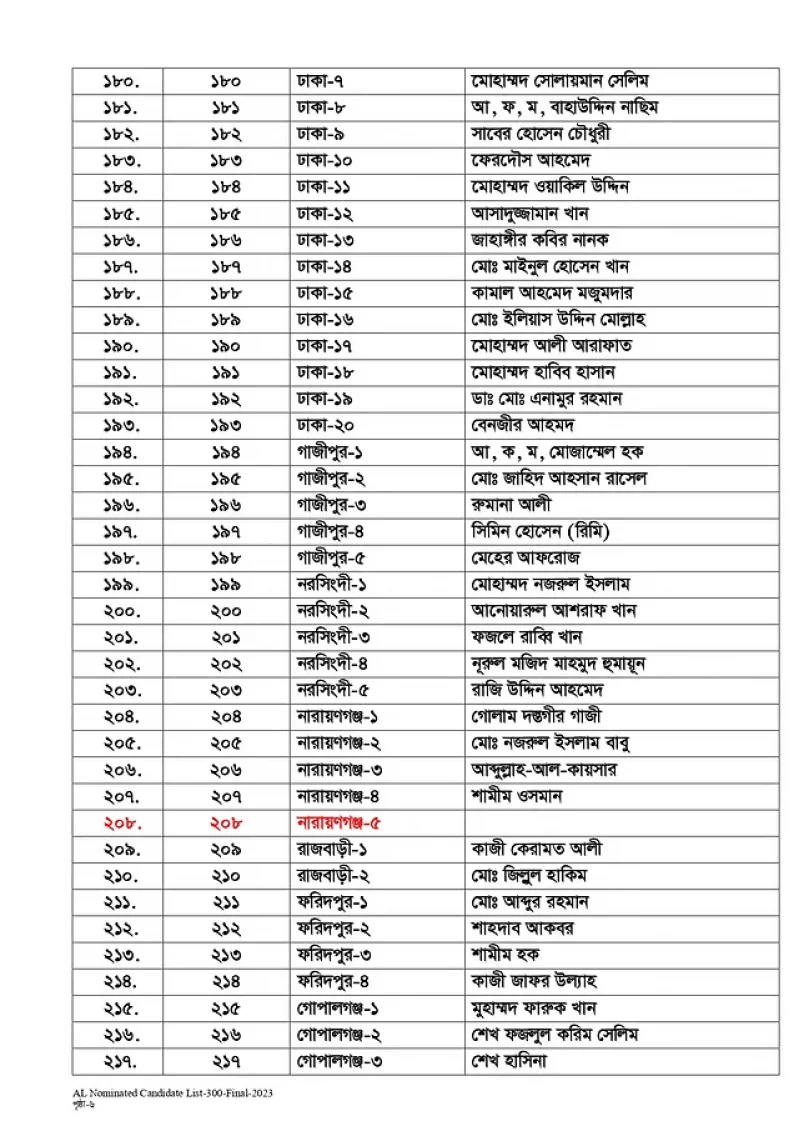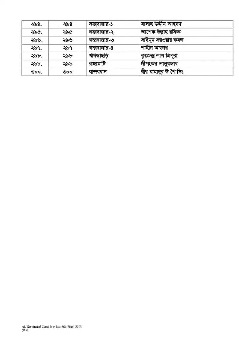 সব মিলিয়ে প্রার্থী ঘোষণা করা হয়েছে ২৯৮টি আসনে। আওয়ামী লীগের সভাপতি শেখ হাসিনাকে গতবারের মতো এবারও দেওয়া হয়েছে গোপালগঞ্জ-৩ আসন। আর নোয়াখালী-৫ আসনে থাকছেন ওবায়দুল কাদের।