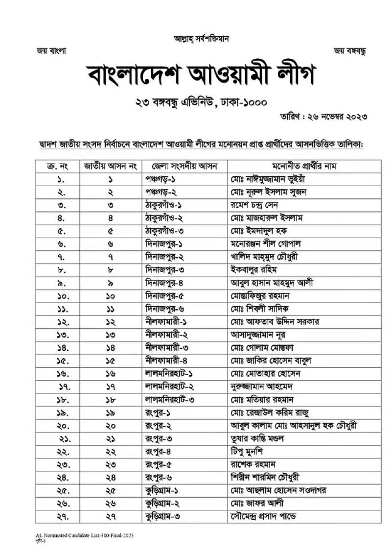 প্রকাশিত হয়েছে : ২৬ নভেম্বর ২০২৩, ৬:৫৪ অপরাহ্ণদ্বাদশ জাতীয় সংসদ নির্বাচনে ৩০০ আসনে আওয়ামী লীগের প্রার্থী তালিকা প্রকাশ করা হয়েছে। সাধারণ সম্পাদক ওবায়দুল কাদের দলের কেন্দ্রীয় কার্যালয়ে এক সংবাদ সম্মেলনে প্রার্থীদের নামের তালিকা ঘোষণা করেন।